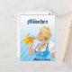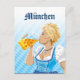 Postcard de calidad con un diseño alemán original. Una hermosa mujer FESTIVAL de CERVEZA vestida con un traje tradicional sucio es beber cerveza. Los elementos de texto se pueden editar fácilmente. Ilustracion de Frank Ramspott, Munich, Alemania.