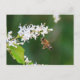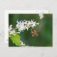 Una abeja con piernas cargadas de polen que se dirige a una flor en un arbusto para recoger más.
