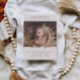 A soft beige baby birth thank you postcard designed with a clean, timeless layout. This design features a warm neutral background paired with elegant dark brown typography for the headline and gentle taupe text for the body, creating a calm and balanced look. The minimal layout highlights the baby photo beautifully, making it a meaningful and stylish way to share gratitude with family and friends.