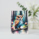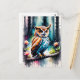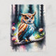 Bello búho marrón y blanco con flores rosadas y hojas verdes que crecen de la rama en la que está posado. Al fondo hay un bosque brumoso en grises y azules oscuros. Gotitas de pintura caen desde la parte inferior de la ilustración. Esta hermosa ilustración de una magnífica criatura nocturna es ideal para cualquier amante de las aves.