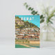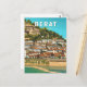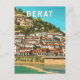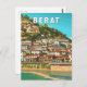 Diseño de viaje vectorial retro de Berat. Berat es una ciudad en el río Osum, en el centro de Albania. Es conocida por sus casas blancas otomanas.