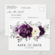 Elegante postal de tarjeta de save the date de mediados de verano con flores que presenta un ramo de rosas de acuarela peonías en tonos de ciruela morada, floral de marfil de champán y salvia, exuberantes hojas botánicas de eucalipto verde. Por favor, busque más diseños y variaciones coincidentes en mi tienda "blissweddingpaperie". Y no dude en contactarme para una mayor personalización o artículos coincidentes.