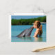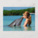 Bonita tarjeta animal que muestra a un delfín besando a un joven chica en la playa.
