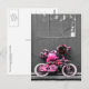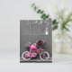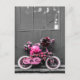 La bicicleta rosa de una niña adornada con flores y plumas rosas, en el exterior inclinada contra la pared, bajo una ventana. La bicicleta es de color y está aislada del fondo blanco y negro. Foto de George Hodan