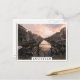 Postal de algunas bicicletas encerradas en el bar de un puente sobre el canal Prinsengracht, bordeado por típicas casas-canal al atardecer en el centro de Ámsterdam en los Países Bajos con un borde blanco y en negro el texto "Ámsterdam".