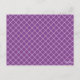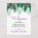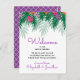 Esta tarjeta de bienvenida boda incluye un ilustracion de flores tropicales de colores vivos y ramas de palmeras en la parte superior de la invitación. El reverso es púrpura con un estilo de entramado blanco.
