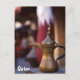 Una cafetera frente a una bandera catarí en el popular Souq Waqif de Doha. Una cafetera simboliza la bienvenida en todo el mundo árabe.