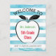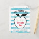 Esta postal presenta un dibujo en blanco y negro de una manzana sobre un fondo rayado de color azul. El texto de personalizado rojo y verde le permite añadir el nombre del profesor, el grado y la escuela.