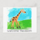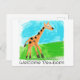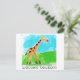 ¡El nuevo mundo a mi alrededor! La jirafa del bebé está corriendo alrededor de la postal para dar la bienvenida a un recién nacido.