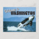 Bienvenidos al estado de Washington con una foto de un puentecito de Orca con montañas costeras en el fondo, y bienvenidos a Washington saludando con fuentes de estilo vintage.
