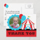 Puedes fácilmente agregar la foto de tu hijo y un mensaje de agradecimiento a esta linda tarjeta postal Big Top Circus Thank You antes de pedir. O déjalo en blanco y escriba a mano en tu mensaje! Un diseño de circo rojo, blanco y azul con la gran carpa y los globos.