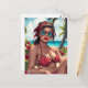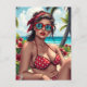 Postal de arte pop de playa. Un lindo ilustracion de personalizado al estilo de un libro de historietas de una mujer con un puntito polka rojo bikini, bandana y gafas de sol.
