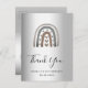A thank you card for a 21st (or any age) birthday. A faux silver metallic looking background. Decorated with a modern abstract, minimalist painted rainbow with hearts. On front large black colored hand lettered script and the text: Thank You, your text, title and a date.