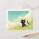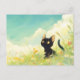 This heartwarming design features an incredibly sweet black kitten with large, soulful yellow eyes and a curious expression. Rendered in a soft, luminous watercolor style, the kitten is shown looking upward toward a bright, sun-drenched sky filled with fluffy white clouds. The character is nestled peacefully within a vibrant field of hand-painted wildflowers in cheerful shades of yellow, orange, and white, with tall blades of green grass swaying in a gentle breeze. The background is a dreamy wash of light blue and soft yellow light, creating a sense of a quiet, peaceful summer morning in a beautiful garden. The overall aesthetic is bright, hopeful, and full of natural charm, making it an irresistible choice for any fan of cats, kittens, and whimsical botanical art. This cheerful black cat postcard is a wonderful choice for sending a "thinking of you" sunshine note or a playful greeting to a friend who loves feline companions. You might choose to use this cute kitten card for a summer-themed birthday invitation or to celebrate a fun family afternoon spent at a local park or botanical garden with your loved ones. It also makes a precious decorative piece for a nursery wall or a bright addition to a nature journal as a small token of happiness. This versatile design is also an excellent choice for flower shop announcements, garden party invites, or as a heartwarming way to share a short message of joy for any situation or event.
