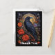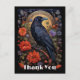Gracias postal con un cuervo negro encaramado en una rama rodeada de flores rojas. Vibra gótica de Guay.