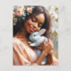 This postcard features an oil painting portrait style of a beautiful Black woman tenderly embracing a bunny rabbit. With peach flowers woven into her flowing hair and a dreamy smile on her face, the cottage-core image evokes feelings of love, peace, and springtime renewal. Perfect for Easter or anytime, this artwork radiates softness and serenity with painterly textures and pastel hues.