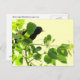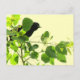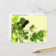 Esta postal muestra un pájaro negro de alas rojas en una rama hacia arriba en un árbol de álamos. Está asomando por detrás de las hojas verdes doradas. El cielo tiene un matiz amarillo muy pálido.