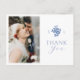 Moda y simplicidad moderna. Esta memorable postal de "gracias" presenta una foto de un par de fotos, un bonito conjunto de fuentes contemporáneas y un monograma floral de azul polvoriento, con un fondo blanco nítido en el frente y un blanco contrastante en la parte posterior.