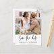 Foto moderna y elegante Guardar la tarjeta de Boda de fecha. La tarjeta de invitación para guardar la fecha incluye tipografía y moda con letras blancas y un diseño simple sobre un fondo blanco al que se puede añadir la imagen de fotografía de compromiso personalizada.