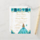 Esta elegante y glamurosa invitación de cumpleaños de sweet sixteen presenta a una hermosa princesa con cabello rubio y piel clara en un vestido de baile turquesa azul. El texto combina la escritura a mano y las fuentes modernas sans serif para un aspecto clásico y sofisticado. Los arreglos florales, las mariposas y el confeti dorado crean la mezcla perfecta de rústico y chic.