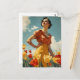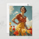 Una cautivadora postal vintage de 1950 presenta a una mujer de pie elegante en medio de un vibrante mar de tulipanes. El campo es un caleidoscopio de colores, con flores de tulipán en varios tonos que crean un paisaje pintoresco. La mujer lleva un atuendo clásico de los años 50, exuberando una sensación de elegancia intemporal, a medida que se convierte en una con el encantador paisaje floral. La imagen capta la esencia de una época pasada, donde la sencillez y la naturaleza se entrelazaban en un momento visualmente impresionante congelado en el tiempo.