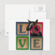 AMOR escrito con bloques de bebé. Una cabra espesa apuntando hacia fuera es curiosa. Un regalo divertido para los amantes de las cabras