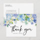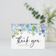 Envíe gracias a los clientes y clientes con este personalizable gracias postal. Cuenta con hortensias de color azul y púrpura, rosas de marfil y vegetación. Personalice esta postal floral de agradecimiento añadiendo sus propios detalles de evento. Esta tarjeta postal es perfecta para bodas de invierno y primavera, duchas de novias, duchas para bebés y otros eventos.