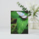 Fotografía de una mariposa morfo azul sobre una hoja en un jardín.