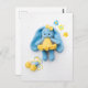 This charming postcard features a handmade crochet bunny in soft blue and warm yellow tones, carefully photographed in a calm, light-filled setting.