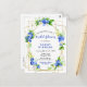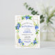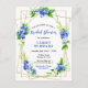 Esta divertida y caprichosa tarjeta postal de la ducha de matrimonio tiene arándanos, margaritas y follaje de color azul sobre un marco geométrico dorado. El texto combina el guión manuscrito y las fuentes serif para un aspecto elegante y moderno. Es perfecto para una ducha de novias rústica de verano.
