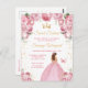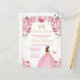 Esta elegante y glamurosa invitación de cumpleaños de dulces dieciséis presenta a una hermosa princesa con cabello marrón en un vestido de baile rosa blush. El texto combina la escritura a mano y las fuentes modernas sans serif para un aspecto clásico y sofisticado. Los arreglos florales, la mariposa y el confeti dorado crean la mezcla perfecta de rústico y chic.
