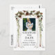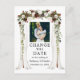 Elegante Boda Canopy Acuarela Blanco Marrón Cambio Floral Fecha Boda Posposición Nueva Tarjeta de Fecha Boda incluye hermosas rosas blancas y flores marrones. El arco de madera boda con dosel incluye vegetación botánica. Foto de pareja.