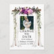 Elegante Boda Canopy Acuarela Morado Cambio Floral La Fecha Boda Postponement New Boda Date Card incluye hermosos rosas y peonías violetas y ultravioletas. El arco de madera boda con dosel incluye vegetación botánica. Foto de pareja.