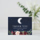 Tarjeta de agradecimiento de boda celestial cielo luna estrellas. Floral de burgundy azul rosa en acuarela. Hojas de eucalipto y vegetación.