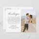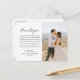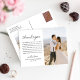 2 boda de fotos gracias postcard presenta un diseño moderno y mínimo con fotos bodas en la parte delantera y trasera de la tarjeta, y simplemente un elegante guión de corazón con letras "gracias". La tarjeta incluye un mensaje de agradecimiento del personalizado de la pareja recién casada que puede ser personalizado en el frente. Cabe destacar que se puede modificar el esquema de color blanco y negro.