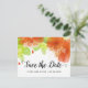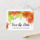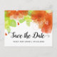 Caligrafía de escritura manuscrita y flores eetéreas naranjas florales casamiento otoño de flores Salven la postal de la fecha. La parte superior está cubierta de flores naranjas bonitos y hojas verdes.