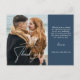 Muestre su gratitud con esta tarjeta de agradecimiento de boda con foto de caligrafía azul marina moderna. ¡Su foto aparece a la izquierda con hermosa tipografía de escritura en la parte superior sobre un fondo azul marino. El mensaje de agradecimiento está en el lado derecho con sus nombres. Totalmente personalizable.