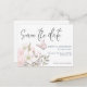 Hágale saber a tus invitados que estás atando el nudo con mucha antelación para que puedan mantener el día libre apuntándoles una cómoda postal en el post. Este elegante diseño tiene Save The Date en una tipografía de escritura elegante y el resto del texto serif se personaliza fácilmente con sus propios detalles. En la esquina inferior izquierda se encuentran las suaves flores de magnolia de color pastel y un motivo de mariposa rosa. Para ahorrar tiempo escribiendo a mano sus nombres de invitados y direcciones, también puede considerar nuestros pegatinas de nombres de invitados y direcciones individuales para los correos de sus bodas disponibles en esta colección.