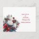 Un hermoso ramo de rosas blancas con cinta roja y pinos hace la invitación perfecta a los nupciales de sus Navidades. La parte trasera de esta postal es el mismo ramo de tamaño más pequeño con texto rojo con todos los detalles.