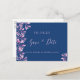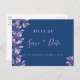 Una elegante y moderna boda Salven la tarjeta de fecha. Fondo azul y texto dorado en el frente. Decorada con flores botánicas de color rosa y follaje. Save the Date se escribe con un guión de estilo con letras a mano moderno. Plantillas para la fecha de boda y el texto. Atrás: nombre, fecha y lugar del boda. Sin color de fondo.