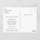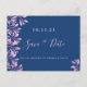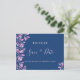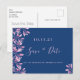 Una elegante y moderna boda Salven la tarjeta de fecha. Fondo azul y texto dorado en el frente. Decorada con flores botánicas de color rosa y follaje. Save the Date se escribe con un guión de estilo con letras a mano moderno. Plantillas para la fecha de boda y el texto. Atrás: nombre, fecha y lugar del boda. Sin color de fondo.
