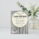 Este encantador establecimiento de bodas cuenta con tablas de madera gris y rústica. Una corona decorativa de flores, corazones y encajes decoran el fondo de la carta y una esfera decorativa redonda con hojas y flores son el centro de la carta con toda la información. Moda de país en su mejor momento.