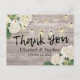 Boda Gracias Plantillas de Postcard - Elegante color de agua blanco adorable Hidrangea Flores y String Lights sobre fondo rústico de madera. ¡Un Diseño Perfecto Para Tu Gran Día! Todos Los Estilo De Texto, Los Colores Y Los Tamaños Se Pueden Modificar Para Ajustarse A Sus Necesidades.