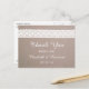 Estas postales de agradecimiento son perfectas para cualquier pareja que planee una boda romántica en el país. El diseño presenta un ambiente rústico de kraft con un falso encaje blanco y una redacción en blanco. El diseño sencillo puede ser personalizado para adaptarse a su evento especial y será el perfecto agradecimiento por cualquier fiesta rústico con temática de moda, incluyendo duchas de novias, compromisos, duchas de bodas, fiestas de cumpleaños y mucho, mucho más.