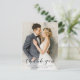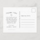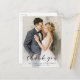 Gracias a sus bodas invitados con estilo con esta elegante foto personalizado gracias postal. Esta plantilla de diseño de tipografía muestra su imagen en la parte delantera con un overlay y las palabras "Gracias" en escritura negra y sus nombres y fecha de boda para personalizar. La parte posterior de la tarjeta postal tiene un mensaje personalizado y una firma en un fondo blanco. Diseñado por la artista Susan Coffey.