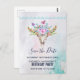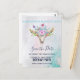 Una tarjeta postal de save the date con un fondo de acuarela turquesa y pastel. Una calavera animal boho chic con un ramo floral sobre su cabeza y pequeñas mariposas revoloteando. Un borde decorativo lindo con pequeñas formas de lágrima en azul claro.