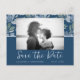 Moderno y boho ahorra la tarjeta de invitación Date boda, con letras de moda y fotos de tus parejas. Alrededor de la foto hay un elegante patrón floral con flores acuarelas y follaje y un sólido color verde azulado en la parte inferior. Obra de arte original en acuarela creada en nuestro estudio. Fácil de editar con sus propios detalles.