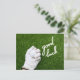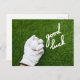 Tarjeta postal de bola de golf en mano con la palabra BUENA SUERTE en verde