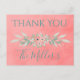 Con el tema de la boda rural en Bonito, estas postales rosas y verdes son la manera perfecta de agradecerte. Sobre un fondo diseñado con pergamino rosa, "Gracias" está escrito en la parte superior con una bonita fuente azul. Debajo hay un emblema floral rosa y verde. La parte posterior sigue la temática rosa y verde. Personaliza tus postales de agradecimiento hoy! Arte floral creado por: AMBilustrations http://www.etsy.com/shop/AMBillustrations/