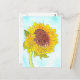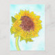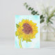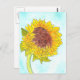 Representación acuarela de un girasol amarillo bonito. Esbozos con tinta negra y pintados con acuarela. Los pétalos son una combinación de amarillo y naranja mezclándose. Las hojas son un verde oliva y el centro de la flor es una aplicación texturada pesada de siena quemada, madera cruda y otros colores tierra. El fondo es azul cielo claro y en verano se respira un ambiente alegre. Obra original.